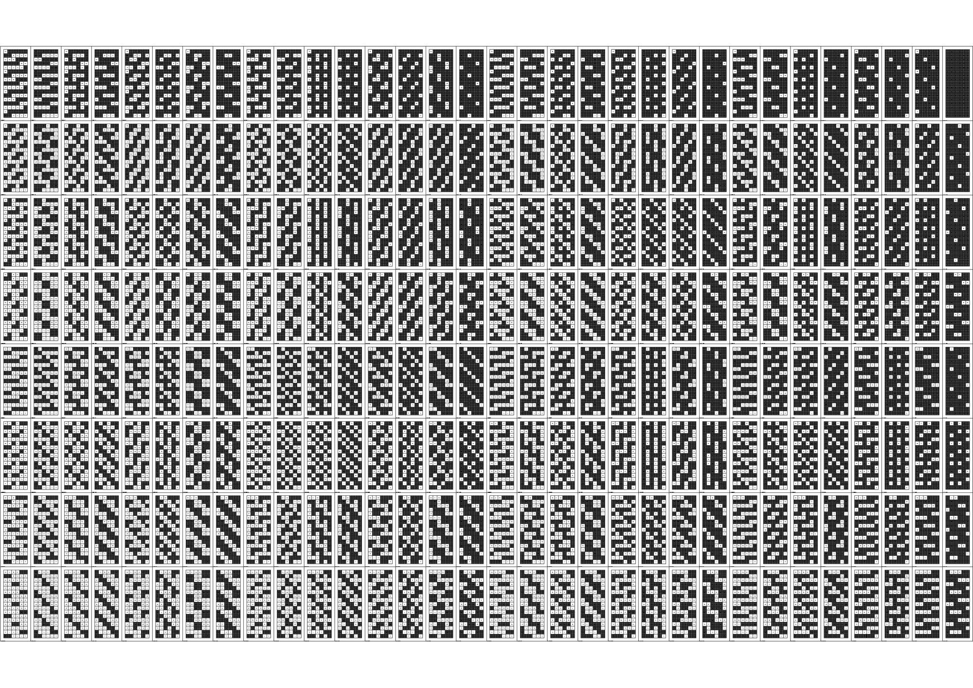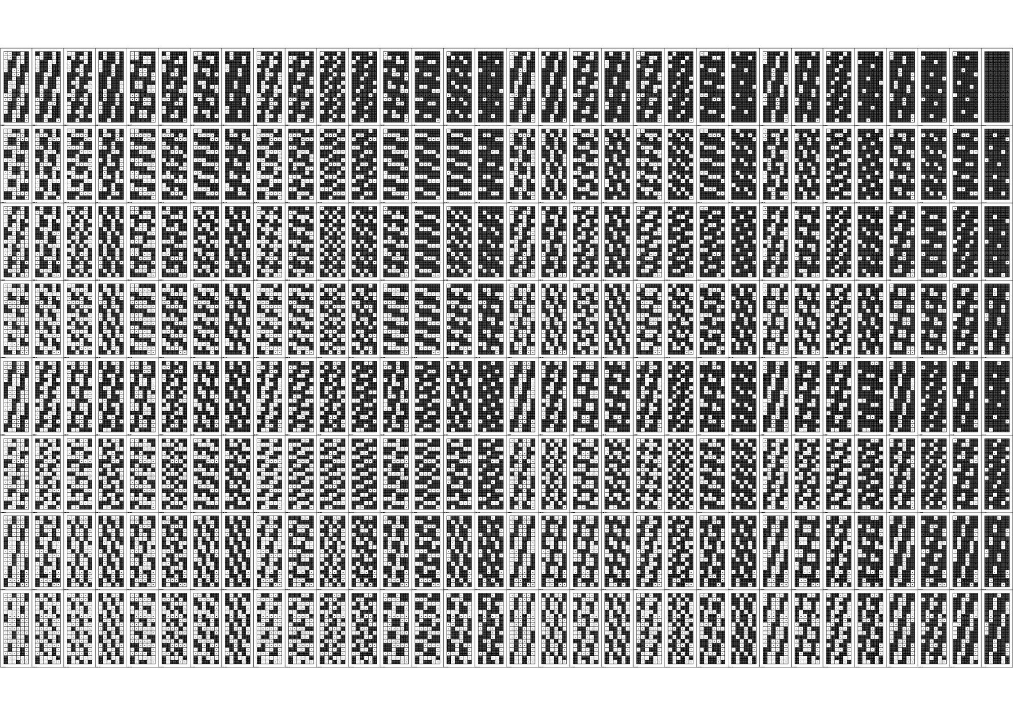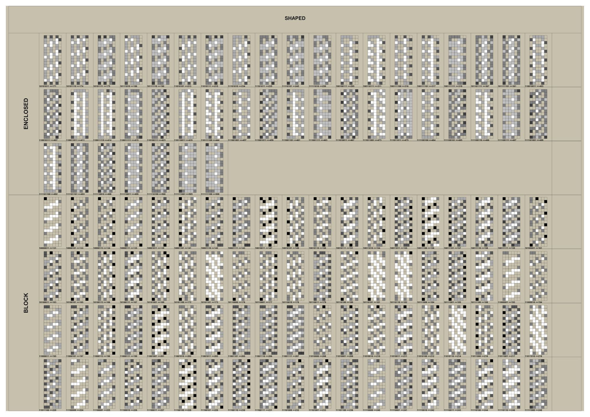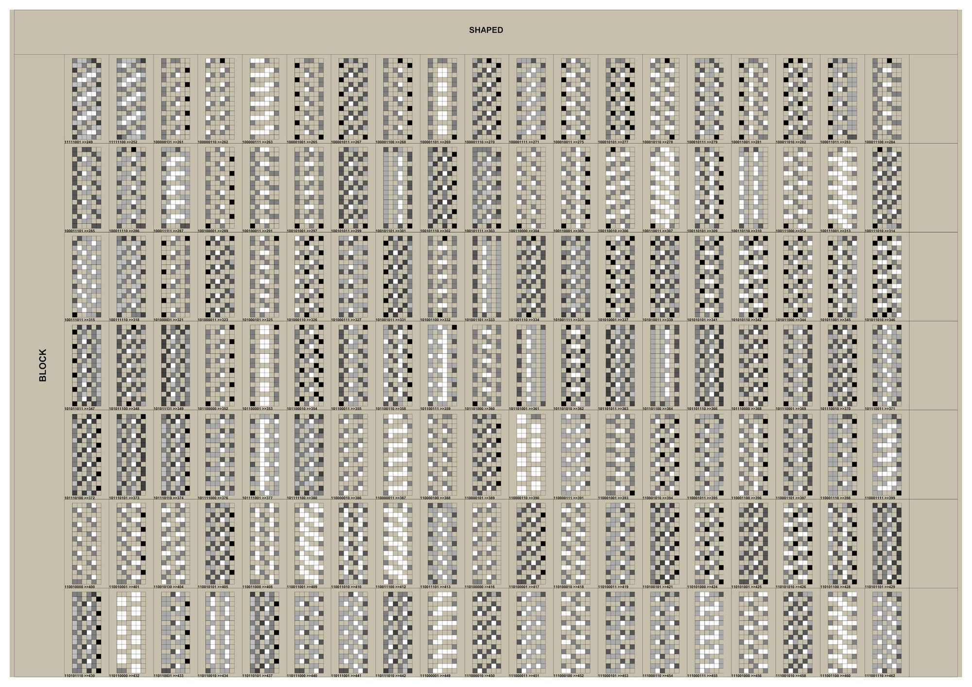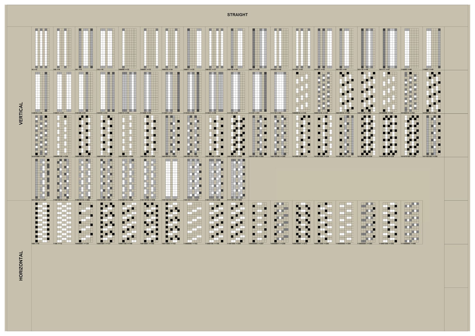 연구의 첫 Test Bed로 선정하게 된 아파트는 18층, 3베이의 주동모듈을 갖고있었다. 수직증축시 디자인의 Variation을 줄 수 있는 방법 중 에너지효율과 가장 밀접한 연관을 갖고있는 요소는 세대, 혹은 베이의 돌출여부였고 이를 이용한 입면 디자인의 군집 및 가능성에 대한 분석이 필요하였다. 다음은 True/False로 보일 수 있는 입면디자인 대안을 만들어 내기위해 Binary Code를 지수와 자리수별로 분류하여 테스트베드 대상 주동입면에 적용한 결과 이미지이다.
