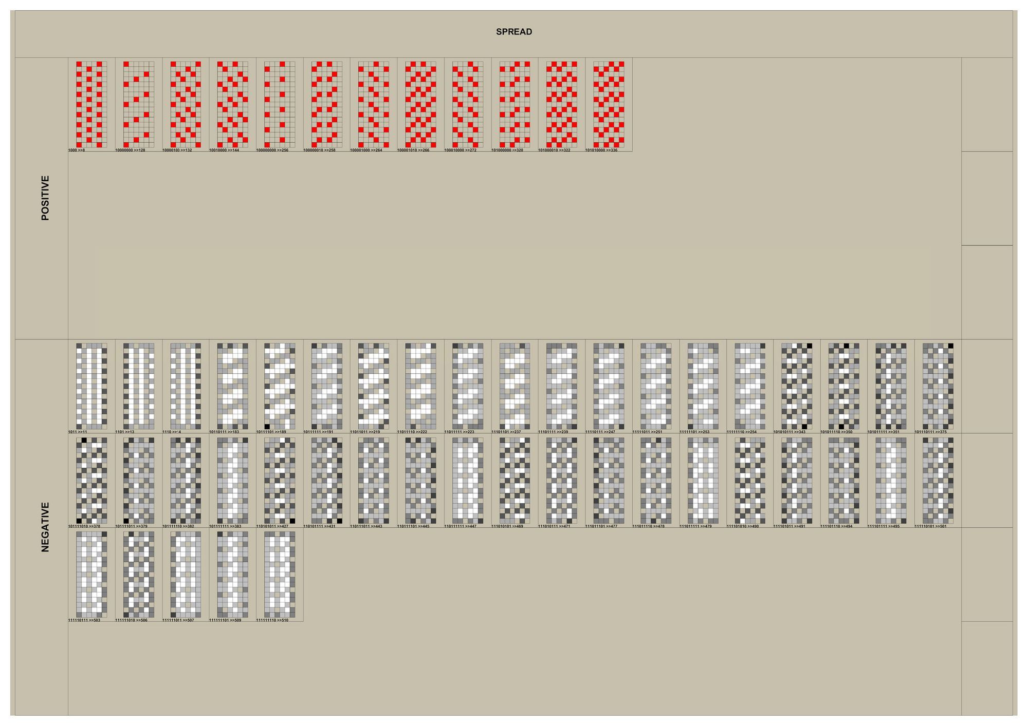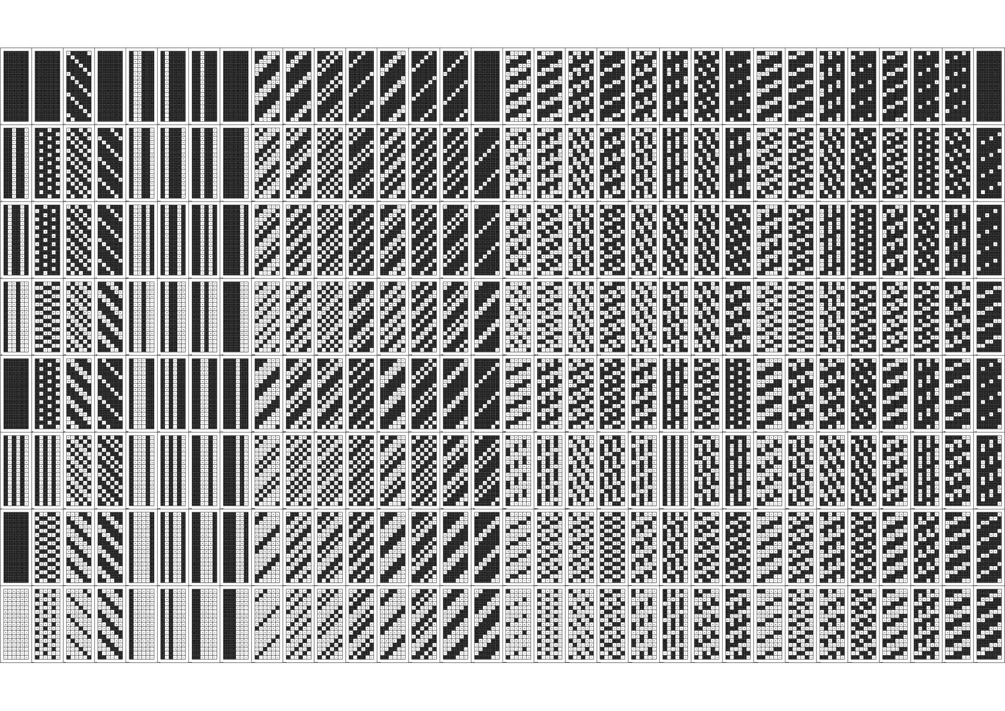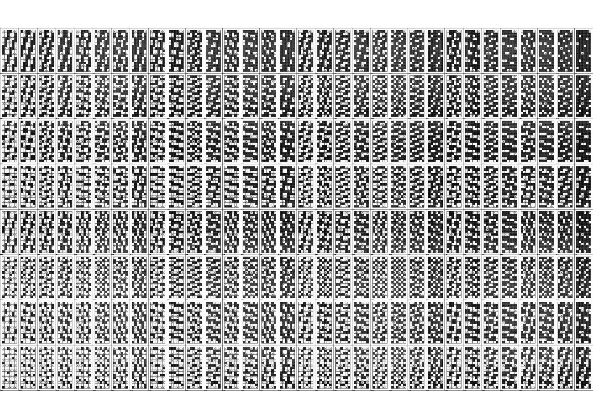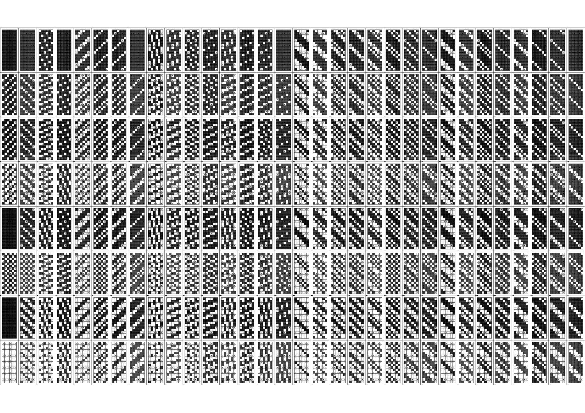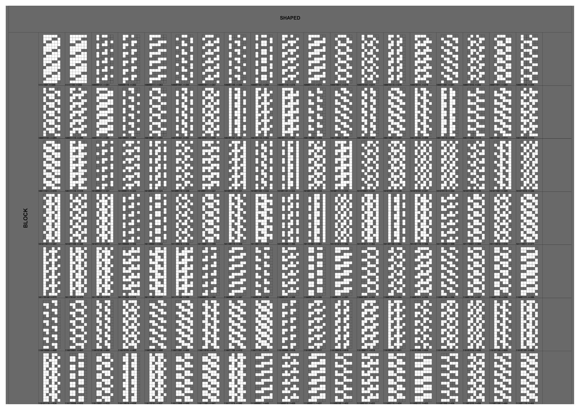 연구의 첫 Test Bed로 선정하게 된 아파트는 18층, 3베이의 주동모듈을 갖고있었다. 수직증축시 디자인의 Variation을 줄 수 있는 방법 중 에너지효율과 가장 밀접한 연관을 갖고있는 요소는 세대, 혹은 베이의 돌출여부였고 이를 이용한 입면 디자인의 군집 및 가능성에 대한 분석이 필요하였다. 다음은 True/False로 보일 수 있는 입면디자인 대안을 만들어 내기위해 Binary Code를 지수와 자리수별로 분류하여 테스트베드 대상 주동입면에 적용한 결과 이미지이다.