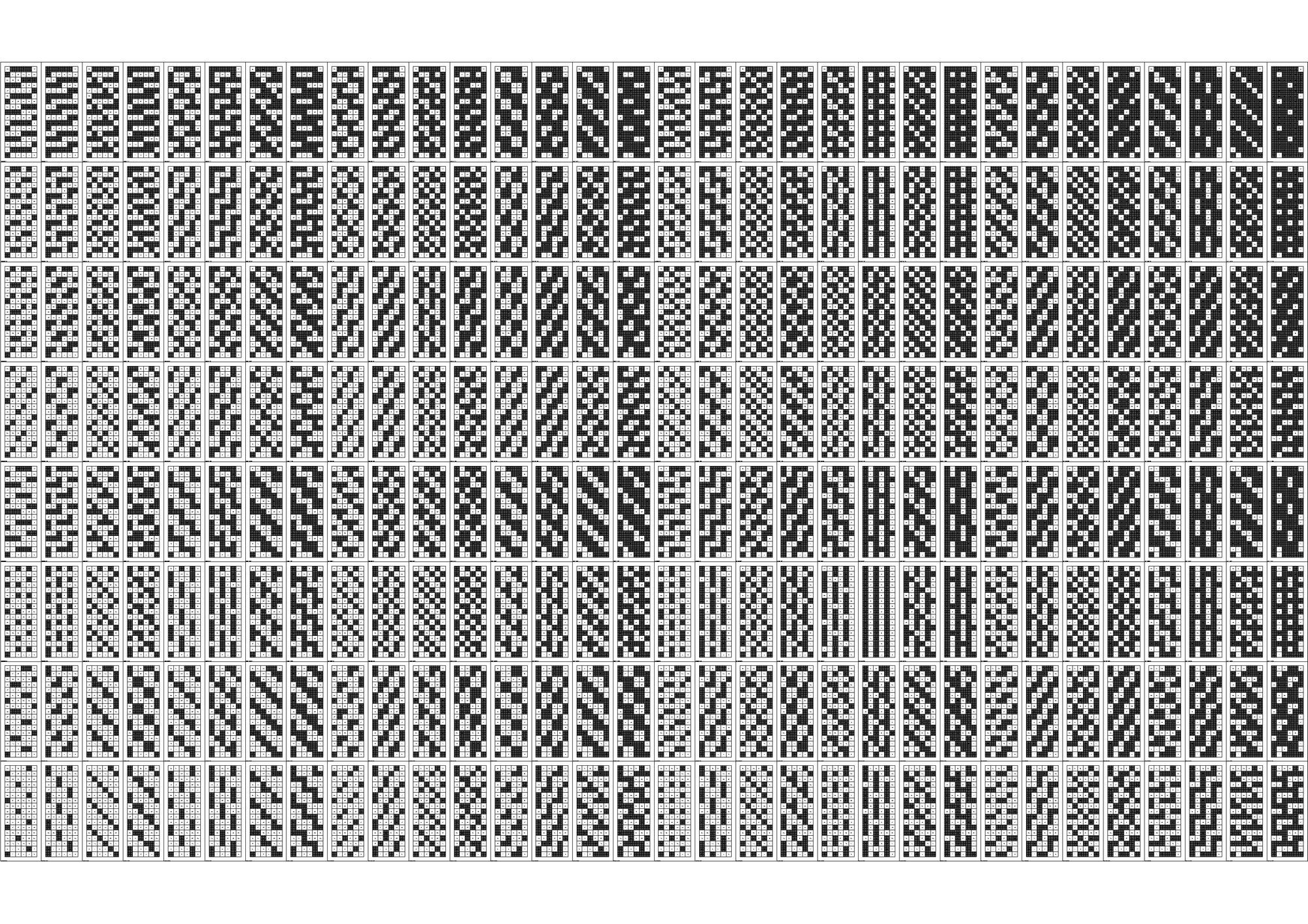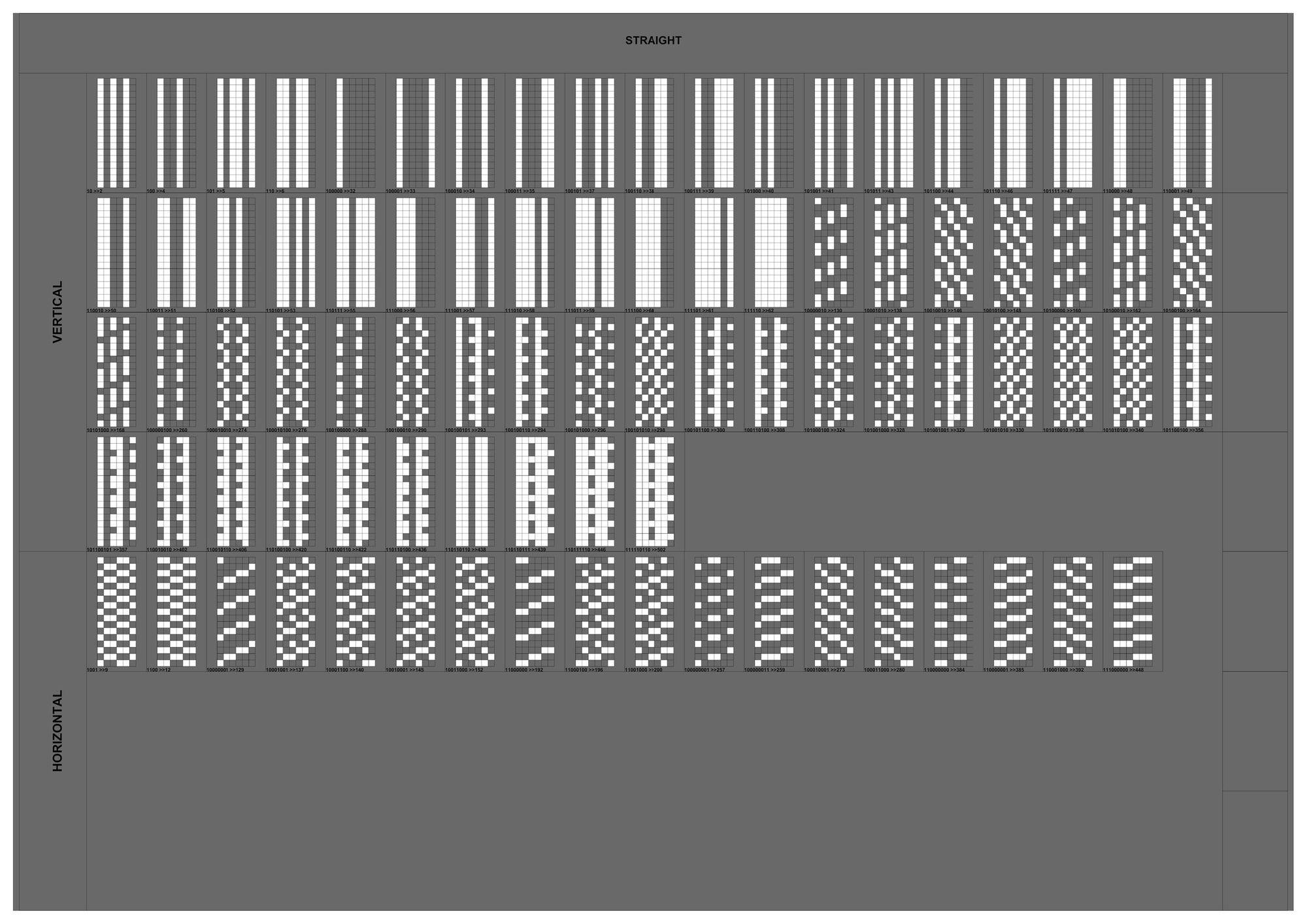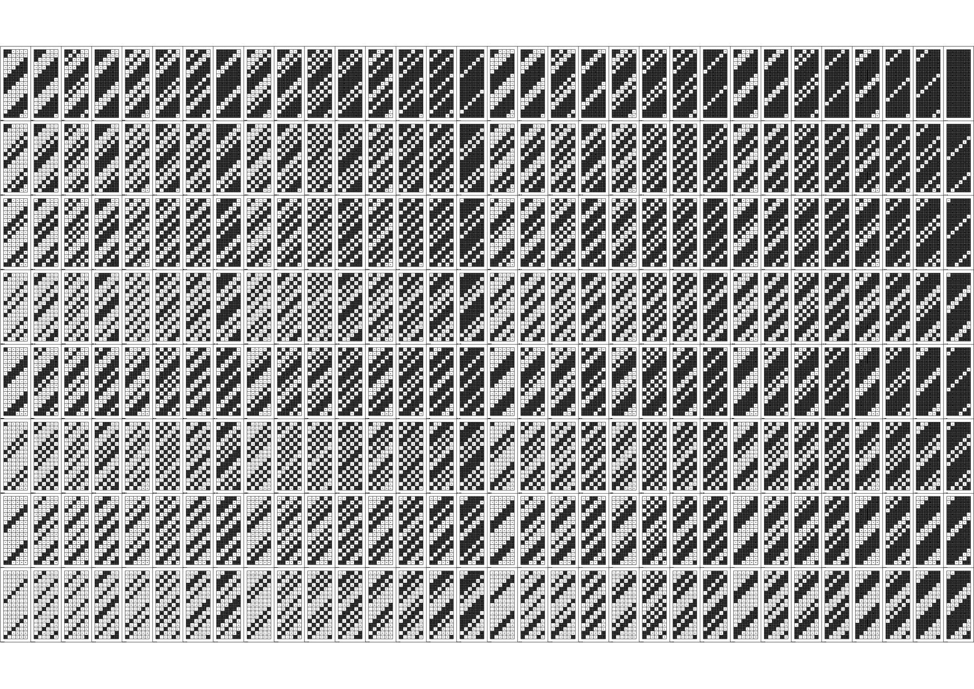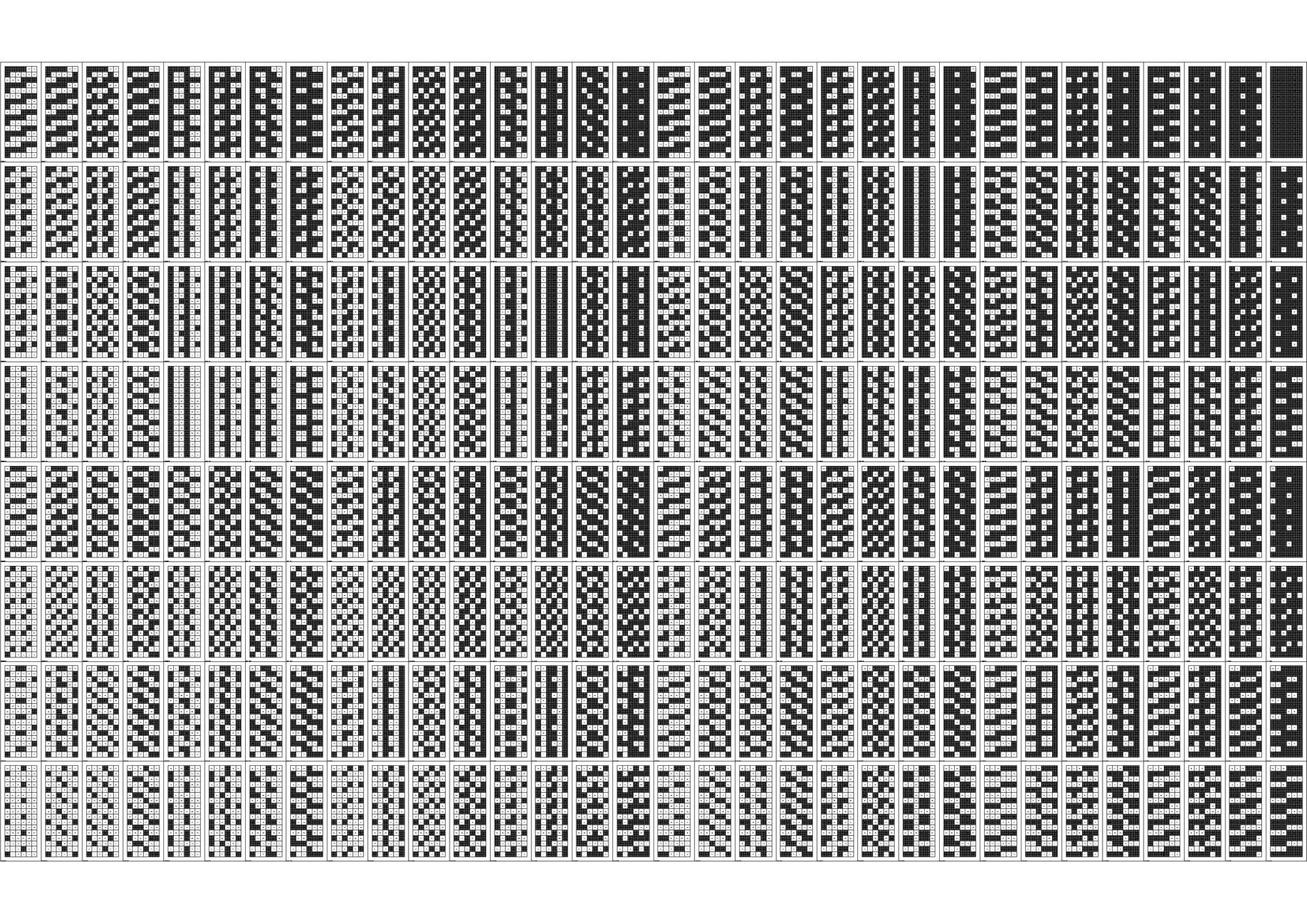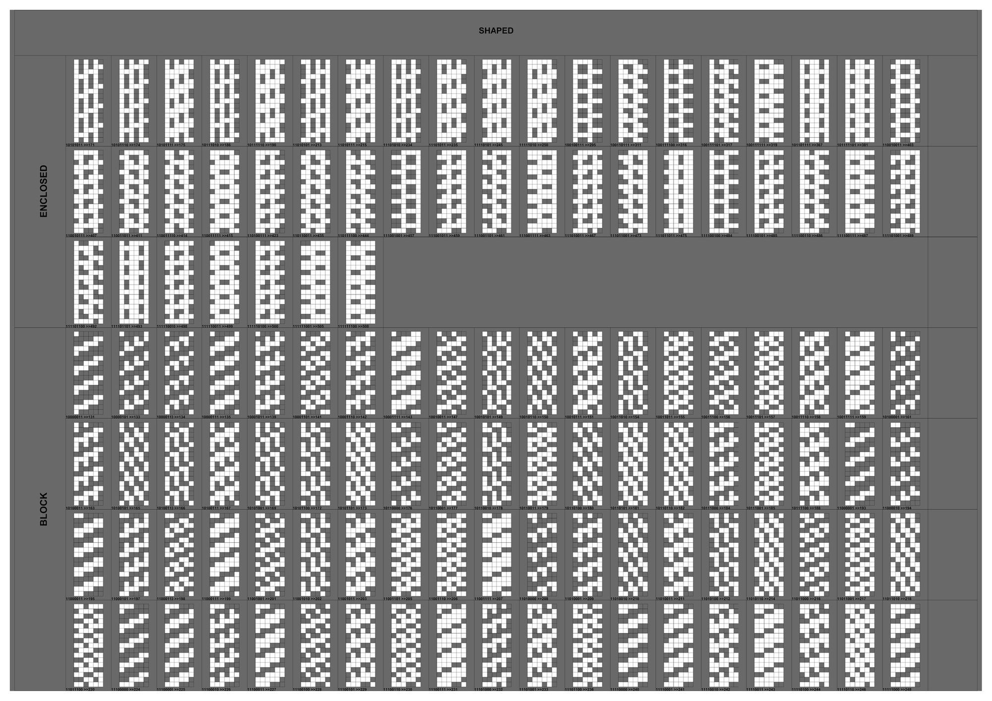 연구의 첫 Test Bed로 선정하게 된 아파트는 18층, 3베이의 주동모듈을 갖고있었다. 수직증축시 디자인의 Variation을 줄 수 있는 방법 중 에너지효율과 가장 밀접한 연관을 갖고있는 요소는 세대, 혹은 베이의 돌출여부였고 이를 이용한 입면 디자인의 군집 및 가능성에 대한 분석이 필요하였다. 다음은 True/False로 보일 수 있는 입면디자인 대안을 만들어 내기위해 Binary Code를 지수와 자리수별로 분류하여 테스트베드 대상 주동입면에 적용한 결과 이미지이다.