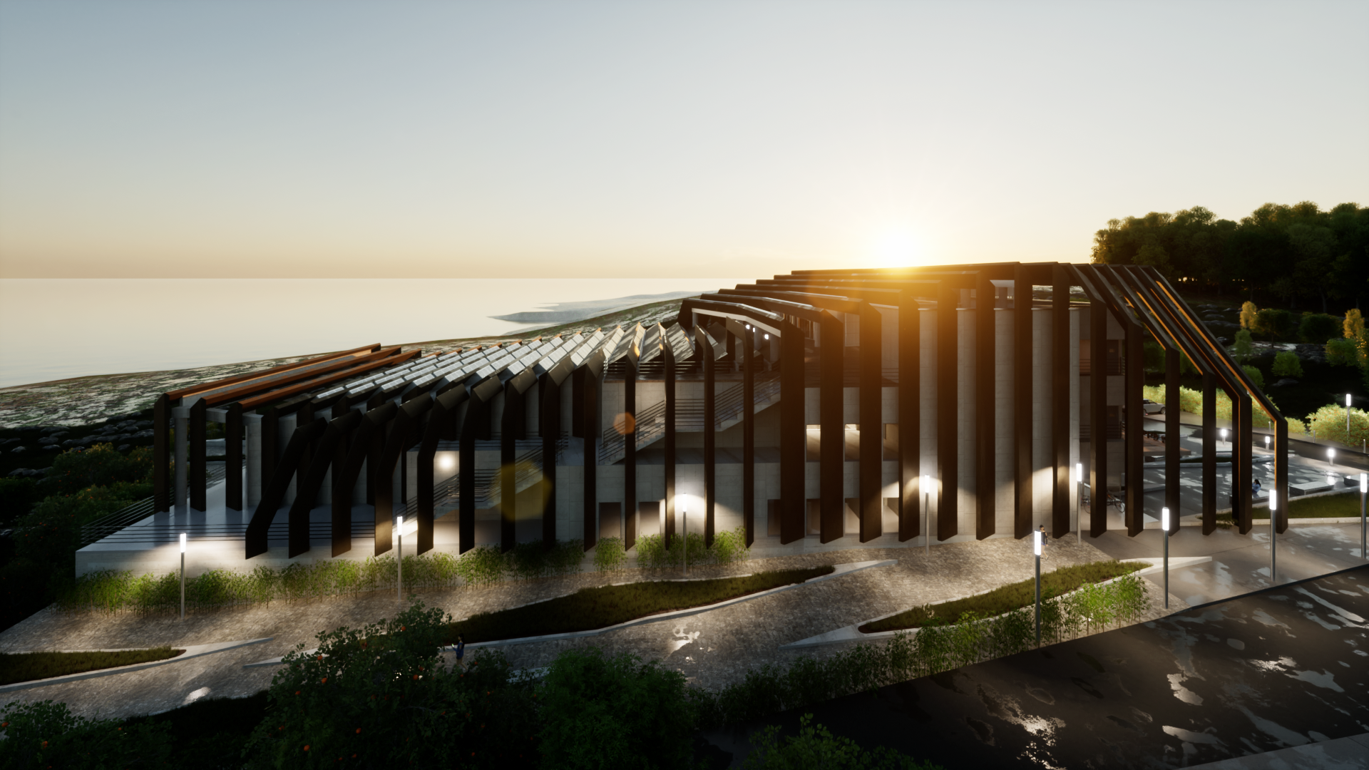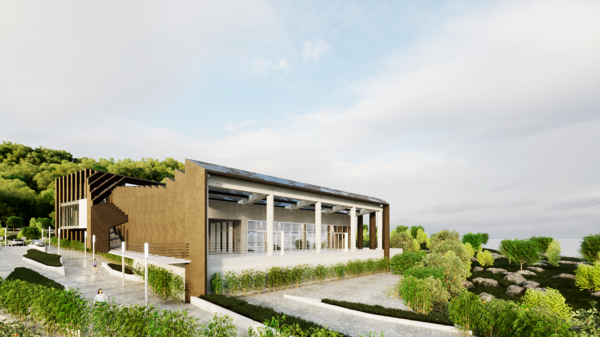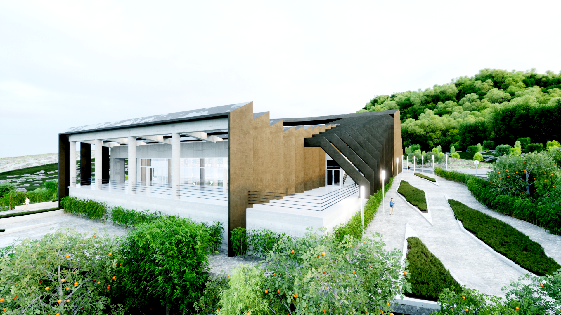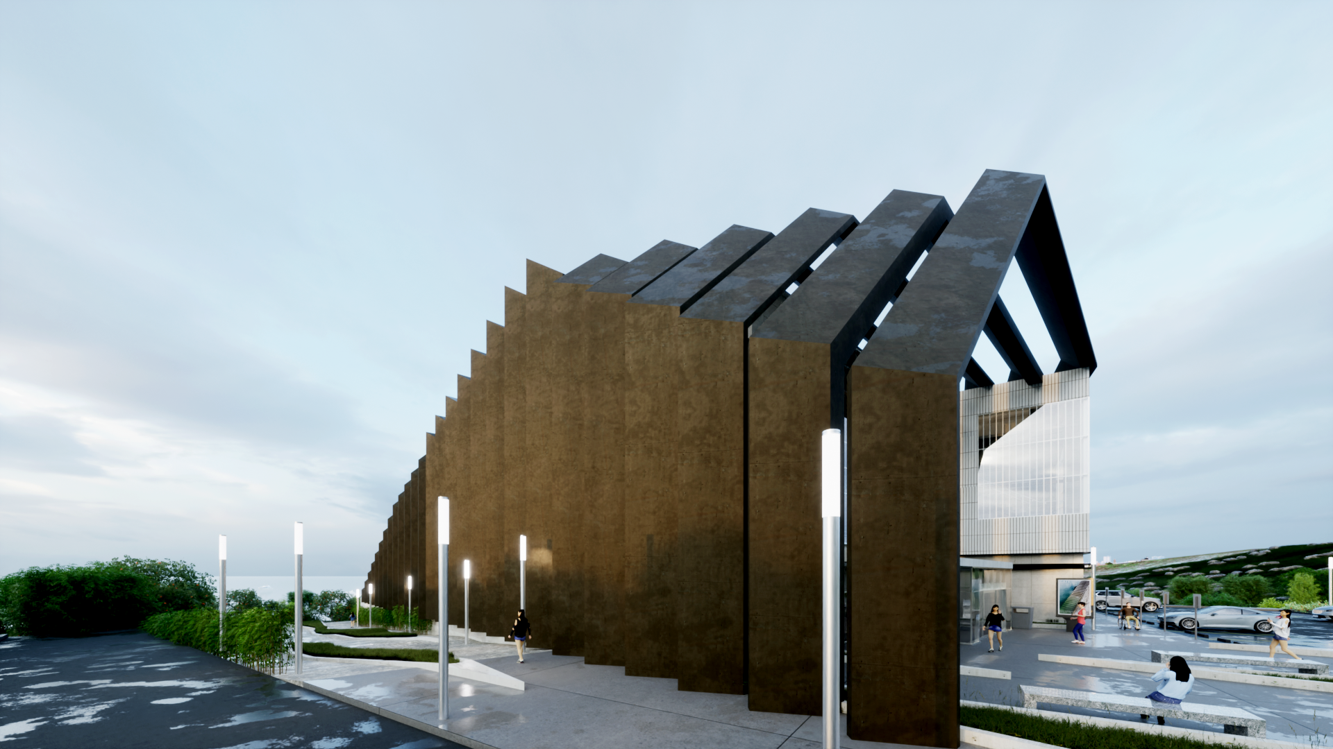 엄폐를 위한 경계는 공간의 성격을 통합하거나 기능적 효과를 더하는 방식으로 공간에 생명을 불어넣는다. 그것의 수직, 수평 레이어들은 마치 오름과 같은 자연공간과 대비되어 누구나 찾게되는 시민의 공간을 표방하고 기능적 특수성들은 그것의 가치를 더하게 한다.