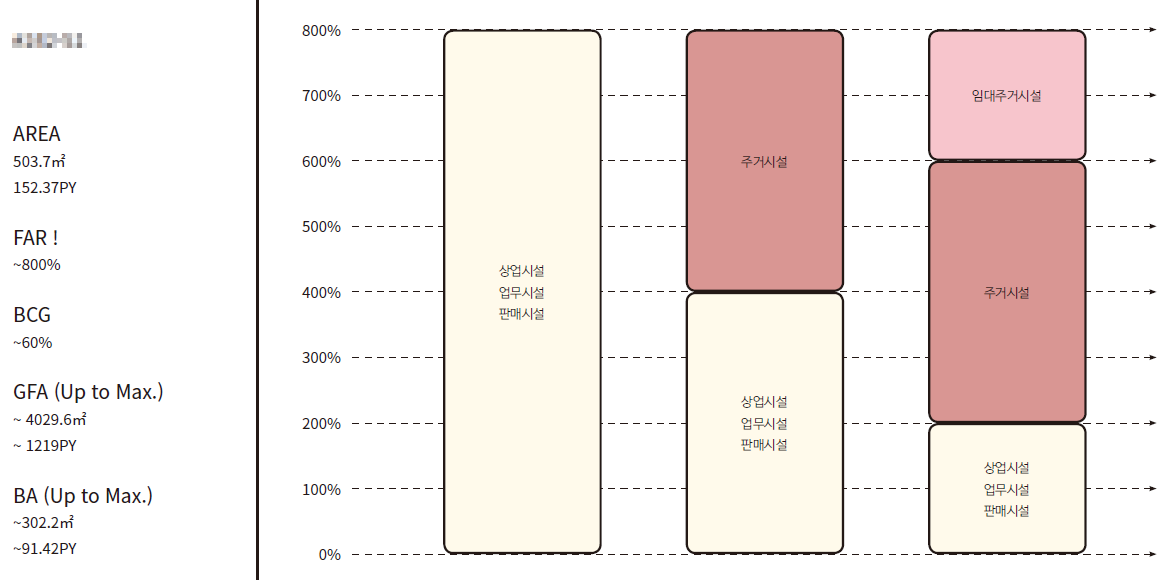 이 단순한 명제 속엔 자신 있게 드러낼 수 없는, 수많은 이해관계와 입장에 따른 이견이 있다. 특히나 많은 가용면적을 계획할 수 있는 대지 일수록. 계획을 하고 의뢰를 받는 자는 이러한 이해관계와 입장 사이에 (누구도 시키지 않았지만,) 중재자의 역할을 떠맡게 된다. 주어진 법규 속에서 찾은 높은 숫자의 결과물을 클라이언트에 자랑하고 싶은 마음도, 보이지 않은 공공의 선의와 미래가치를 클라이언트에 설득하고 싶은 마음도, 모두 가진 채. 어느 것이 선의라고 할 수 없는 중재자의 역할은 그래도 균형을 위해 수렴되기 마련이지만 말이다.