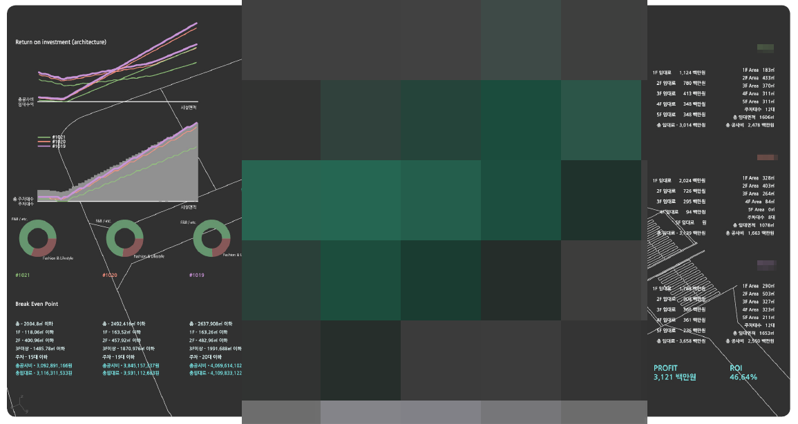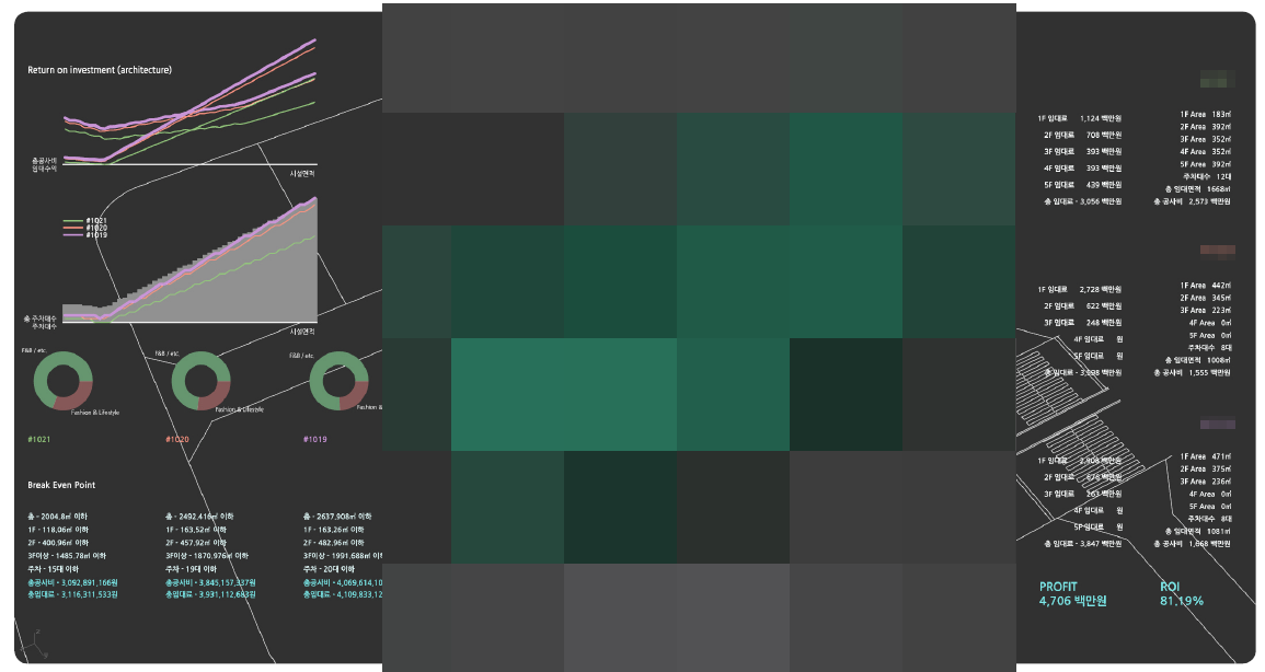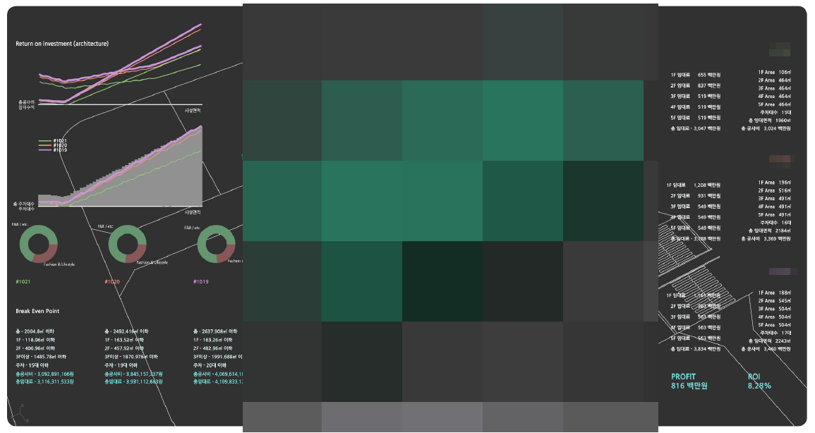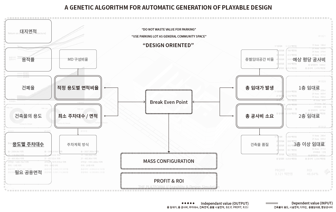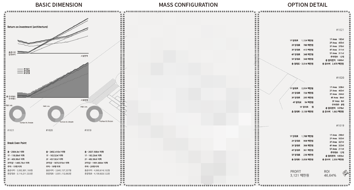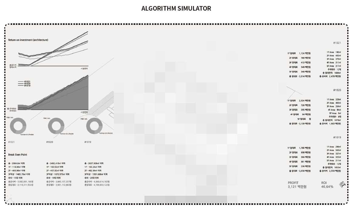 문제는 결국 숫자에서 발견되고 숫자로 정리된다. ㎡ 단위 보다 익숙한 %, ₩의 기호가 붙여진 숫자들은 더욱 클라이언트의 이해를 빠르게 하고 선택을 쉽게 한다. 이러한 연유로 다른 프로젝트에서는 시도할 수 없는 공간적 가치를 익숙한 기호로 치환하여 설명하게 되고 모든 내재적 가치가 포함된 공간계획을 숫자로 설명할 수 있는 알고리즘을 만들었다. 실시간으로 변화되는 건축물의 볼륨에 따라 나타나는 익숙한 기호의 숫자들은 막연한 낙관론과 비관론 사이 어디쯤에서 깊숙한 고민을 끌어내고 흥미를 유발하며 결국, 서로의 관점에서 타협 가능한 범위를 만들어 양분된 선택지 속의 균형보다 상세한 상황들이 고려된 그 안의 균형을 만든다. 뒤돌아보면 불균형이 균형이란걸 설득한 셈이다.
