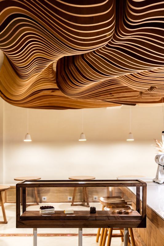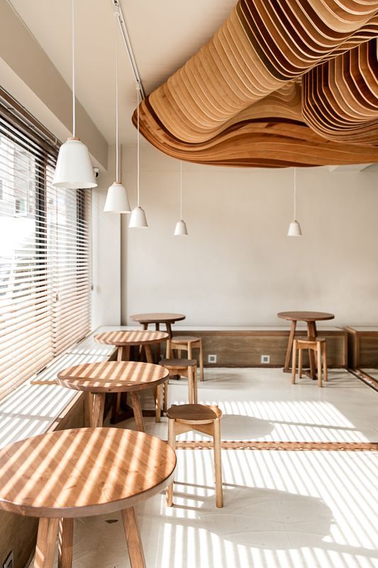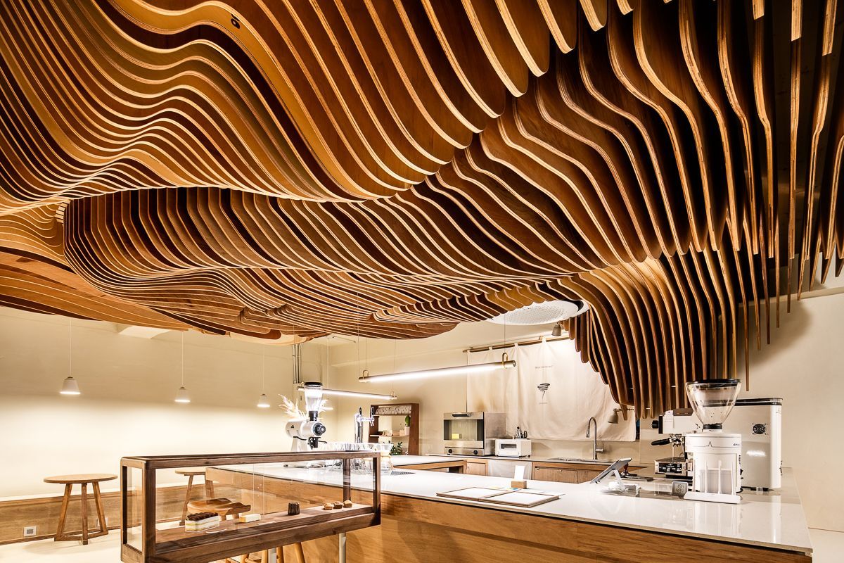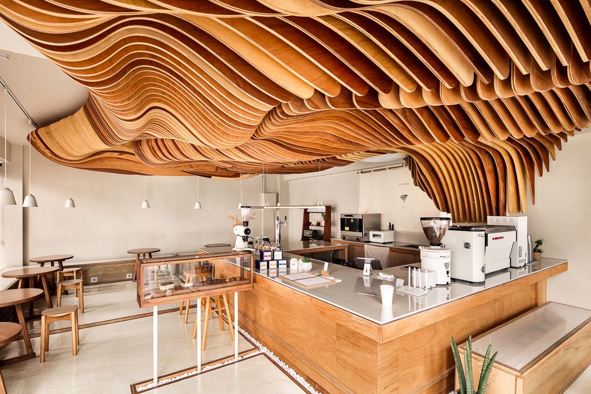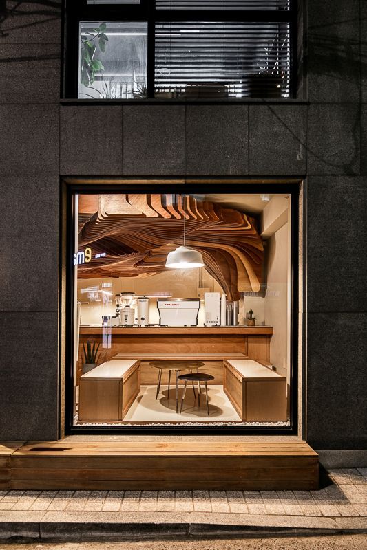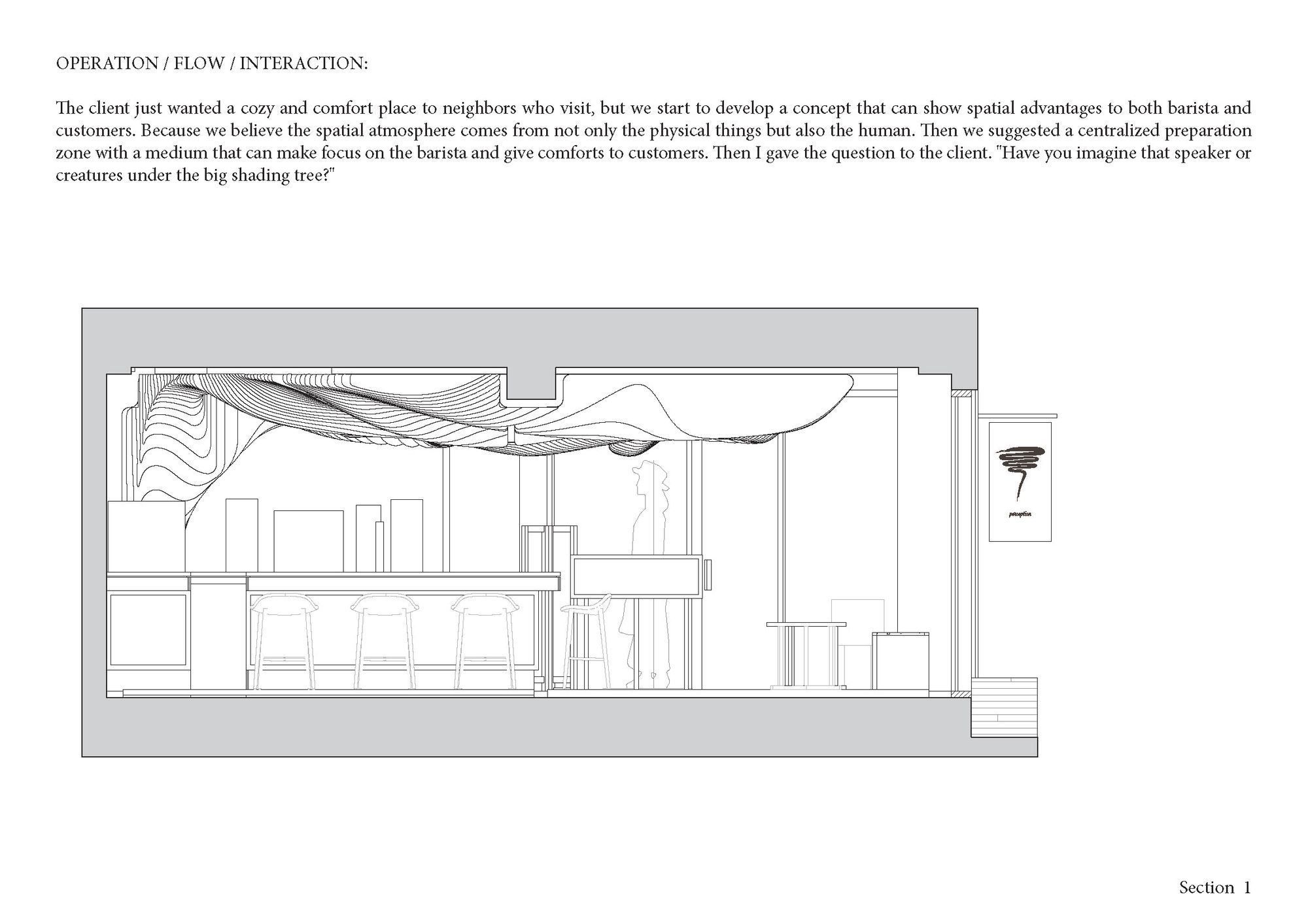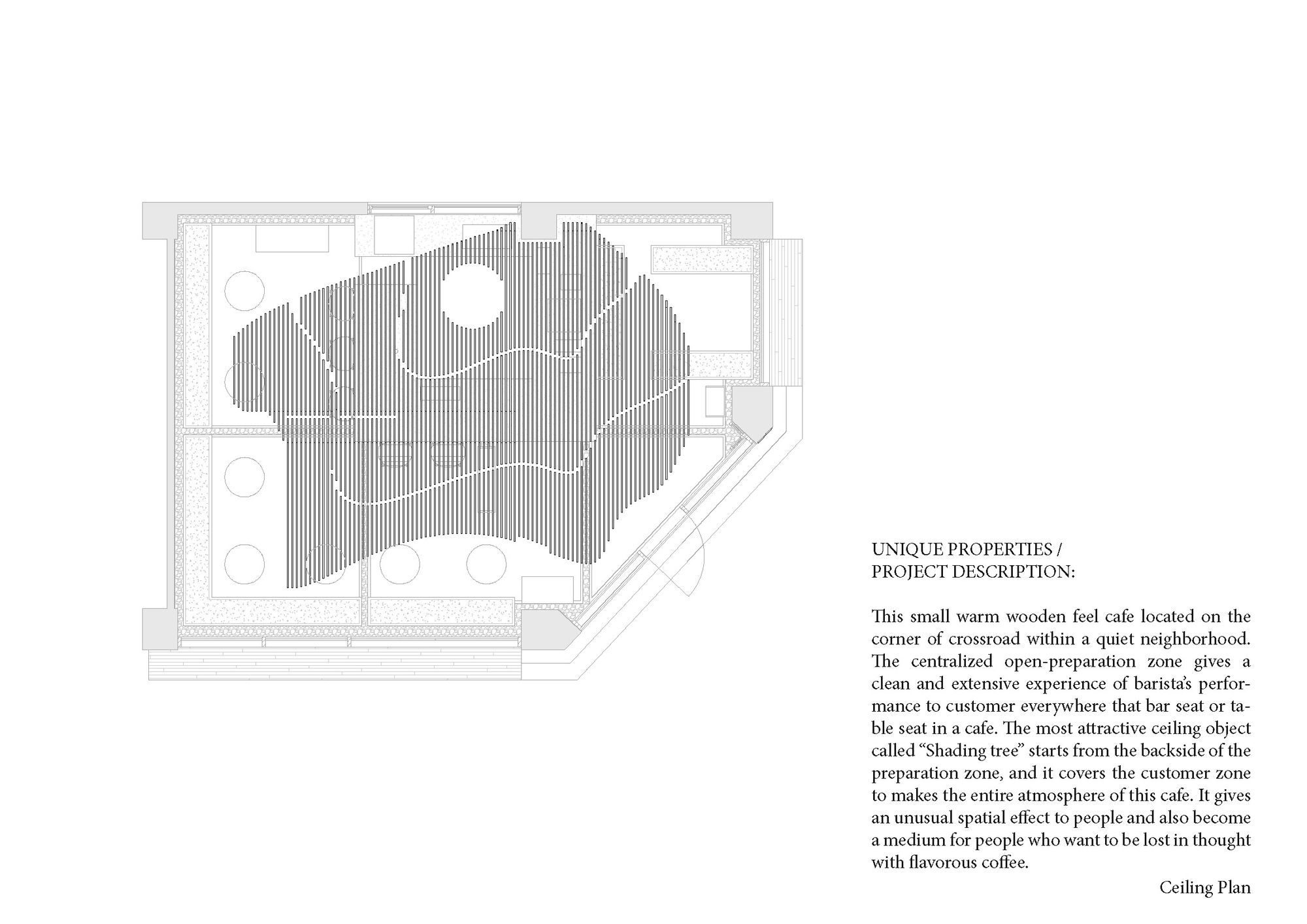 이 포근하고 나무느낌 가득한 작은 카페는 작은 마을의 골목이 만나는 사거리 코너에 위치해있다. 중앙의 오픈된 바리스타영역은 카페의 테이블이나 바 어디에 앉아 있거나 심지어 바깥의 길에 서 있어도 바리스타의 행동 하나하나가 전하는 확장된 경험을 명확하게 느낄 수 있게 해주며, 'Shading Tree'라 이름 붙인, 공간에서 가장 주목을 끌게하는 천정의 오브제는 바리스타영역 뒤에서 부터 시작하여 전체공간을 감싸며 이 카페만의 강렬한 분위기를 만들어 낸다. 이 오브제는 공간을 마주한 사람들에게 특별한 공간적인 느낌과 경험, 더나아가 공감각을 일으키는 기분좋은 매개체가 되며 향기로운 커피향에 취해 생각에 기댈 수 있는 적당한 매개체가 되기도 한다.