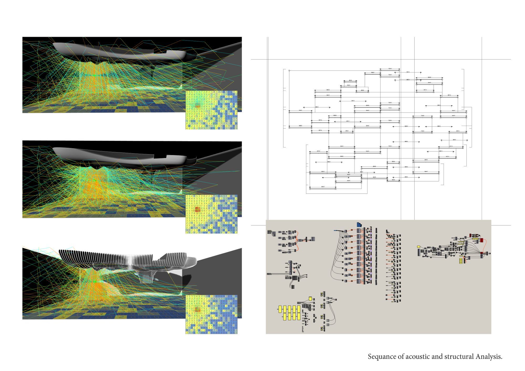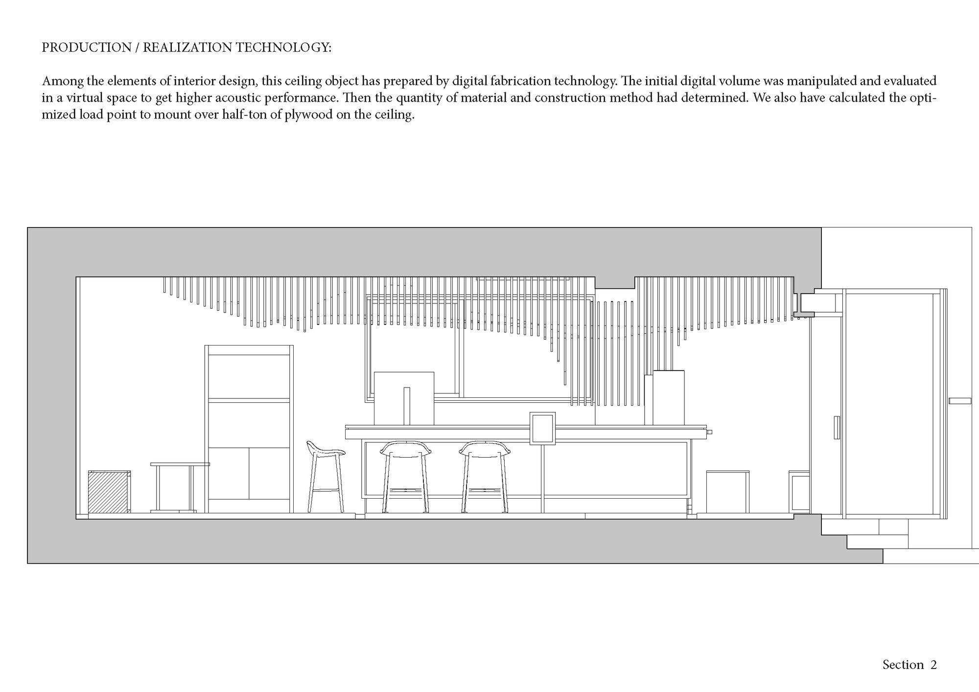 천장 오브제를 만들기 위한 다양한 테스트와 구축실험을 통해 형태를 잡고 공간배치에 따른 음향설계와 물성의 느낌을 최대한 이용하기 위한 연구도 병행되어 졌다. 그런 과정에서 작성된 1:1 스케일의 Shopdwg은 보다 안전한 구조보강을 위한 바탕이 되었고, 커스터마이징된 철물보강과 나무 결합부들은 오브제가 보다 안전하고 가볍게 매달릴 수 있게 하는 중요한 과정이었다.[1]