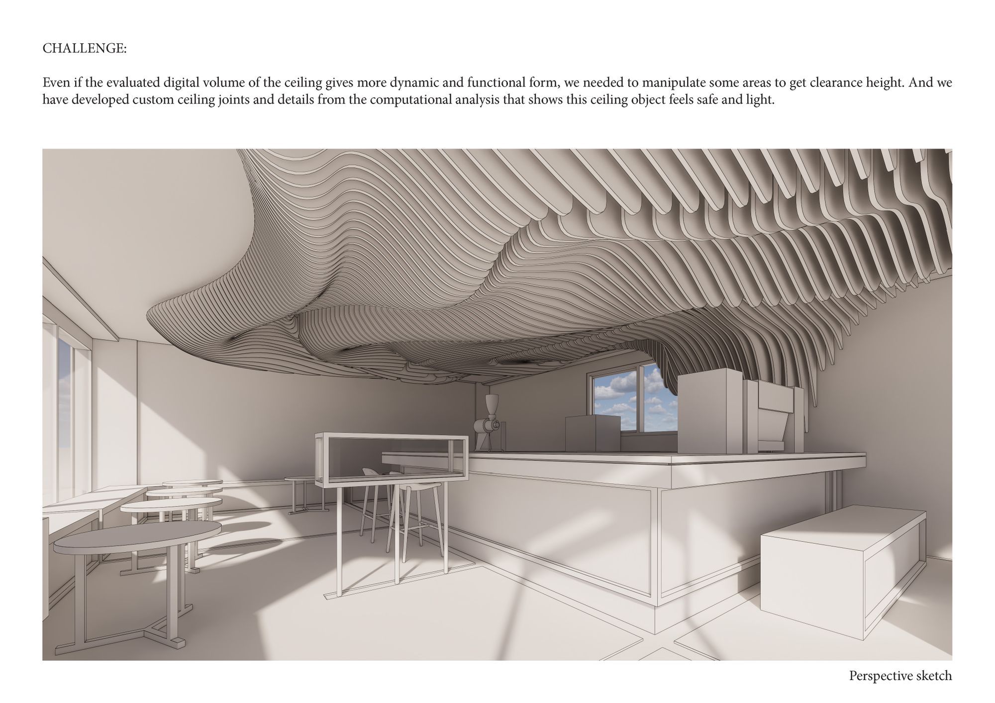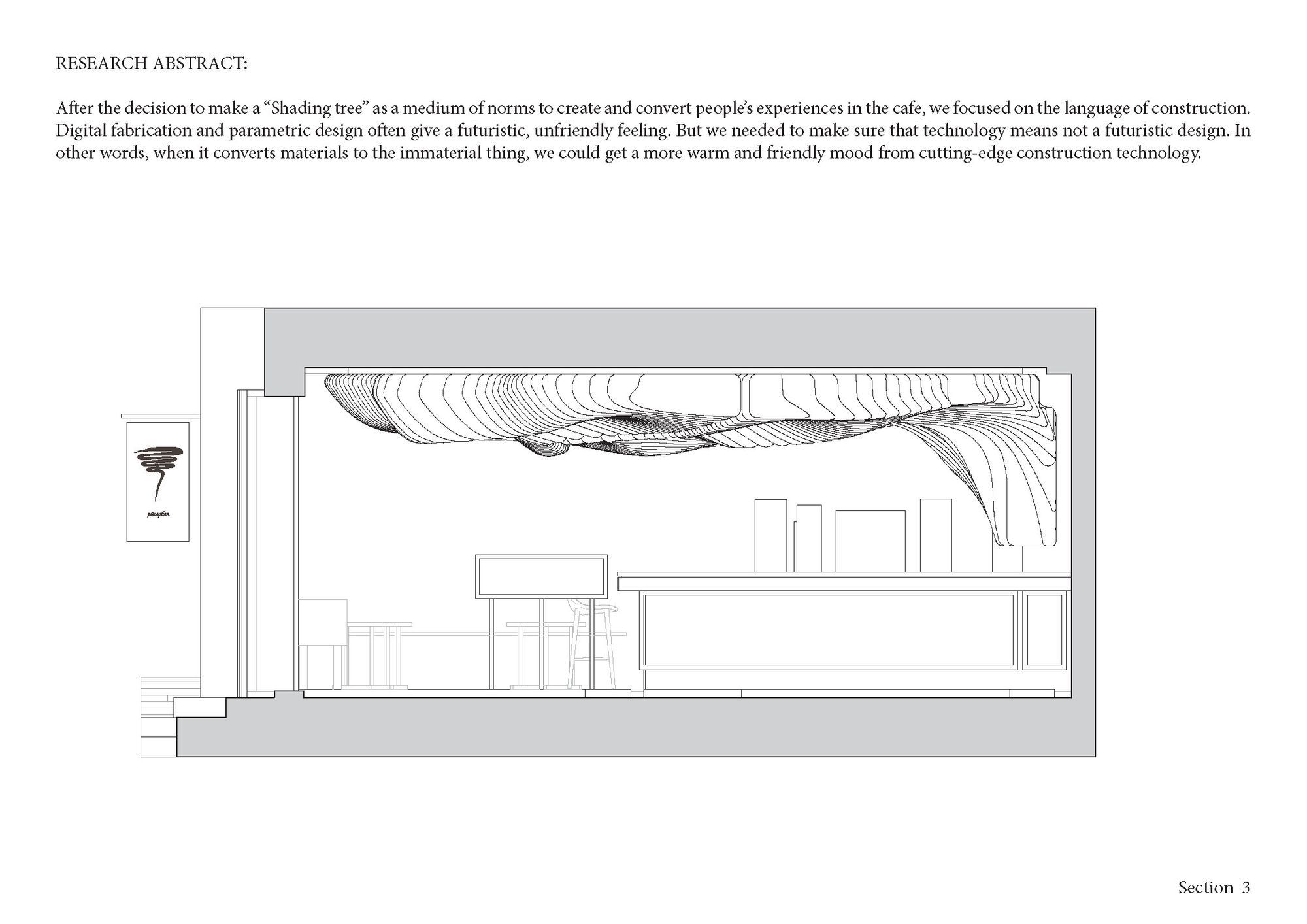 "Shading Tree"를 카페에서 사람들이 만들고 전달 해 나갈 감각적 규범의 매개체로 정의한 이 후 부터는 구축언어에 조금 더 집중할 수 있었다. 아직도 많은 오해를 불러일으키는 것이 디지털을 이용한 기술이나 파라메트릭 디자인 같은 언어들은 사람들에게 미래지향적인 디자인이라거나 친숙하지 않은 느낌을 준다는 것이다. 이것은 Brian이 오랫동안 고민하고 있던 개인적인 과제임과 동시에 반드시 해결해야할 언덕이었다. 이번 프로젝트를 통해 디지털기술 혹은 Computational 디자인이 꼭 그런것만이 아니라는 것을 보여줄 수 있는 좋은 기회였으며, 동시에 물성의 비물성화 과정을 통해 최신기술이 가져다 줄 수 있는 보다 포근하고 친숙한 분위기를 만들 수 있다는 것을 확인할 수 있는 기회이기도 하였다.